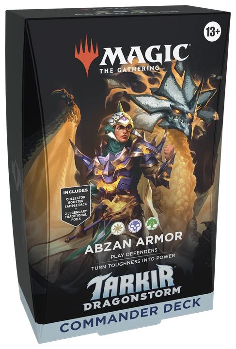Return to the iconic plane of Tarkir for an epic battle between dragons and clans. As powerful dragonstorms spiral Tarkir into chaos and wild dragons darken the skies, the five clans fight alongside their new Spirit Dragons for supremacy over the land. Discover which clan fits your playstyle with Tarkir’s distinct three-color gameplay. Choose your clan and battle your friends with Commander decks each featuring a legendary clan leader of Tarkir and a Spirit Dragon. Commander decks are ready to play right out of the box and contain everything you need to play Magic ’s most popular multiplayer format.