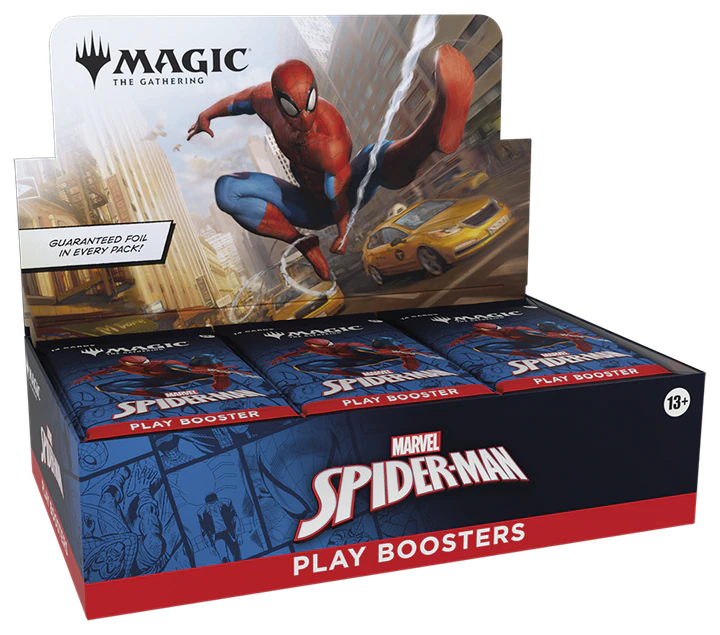 Your friendly neighborhood Spider-Man swings into Magic: The Gathering , and not a moment too soon! Gather web-slingers from across the Spider-Verse and team up to take down the sinister foes that threaten the city. Keep your Spider-Senses primed to spot Borderless treatments that leap right off the page! Play Boosters are the best way to discover all that Magic has to offer. Construct a deck out of your favorite color combinations, draft packs with friends, and open gorgeous Borderless cards—plus you can find a foil in every booster. A full display of Play Boosters supports a Draft event with extra left over to maximize the fun for everyone!